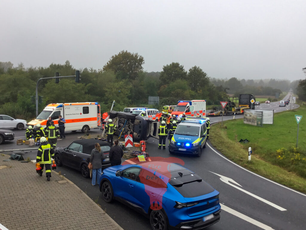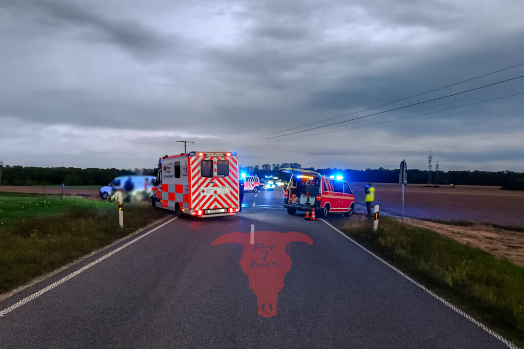 Verkehrsunfall zwischen zwei Fahrzeugen. Eine verletzte Person wurde zuerst durch Ersthelfer betreut und im Anschluss durch die Feuerwehr bis zum Eintreffen vom Rettungsdienst. Vor Ort Sicherung der Einsatzstelle (Absichern und Brandschutz) sowie Aufnahme von Betriebsstoffen. Die Straße war während der Maßnahme voll gesperrt. Im Anschluss wurde die Einsatzstelle an die Polizei übergeben.